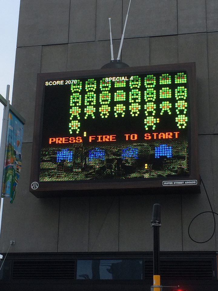 Players control the game with a giant joystick and buttons from the other side of the street. The game runs 24 hours per day and is free to play.